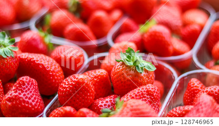 Fresh, vibrant red strawberries are neatly packed in clear plastic containers, highlighting their juicy appeal and readiness for sale or consumption. High quality photo