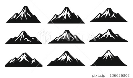 Black Solid Volcanic Peak Mountain Silhouettes Set of Six on White Background