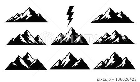 Black Solid Lightning Strike Mountain Silhouettes Set of Six on White Background