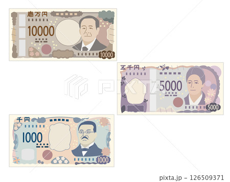 一万円・五千円・千円の新札の3枚のイラストのセット