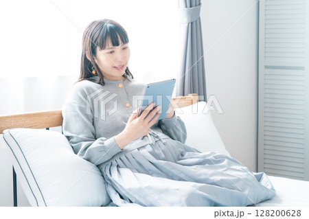 ベッドに寝転び肌着を挟んで赤ちゃんが待ち遠しい母と娘