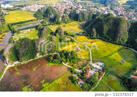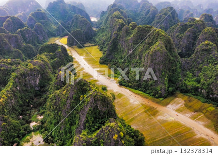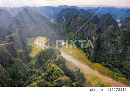 the majestic scenery on Ngo Dong river in Tam Coc Bich Dong view from drone in Ninh Binh province of Viet Nam
