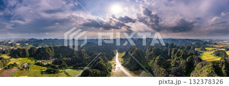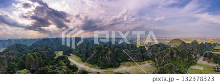 the majestic scenery on Ngo Dong river in Tam Coc Bich Dong view from drone in Ninh Binh province of Viet Nam BANNER, LONG FORMAT