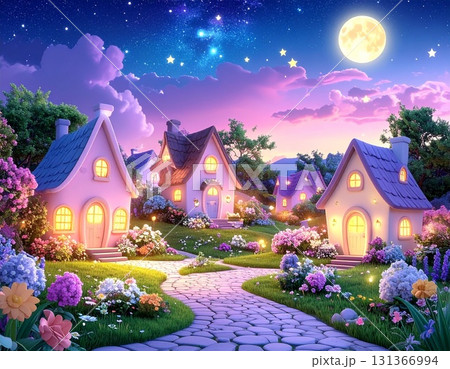 星空の下に光り輝く可愛らしい家々が並ぶ幻想的で夢のあるファンタジー村の風景イラスト