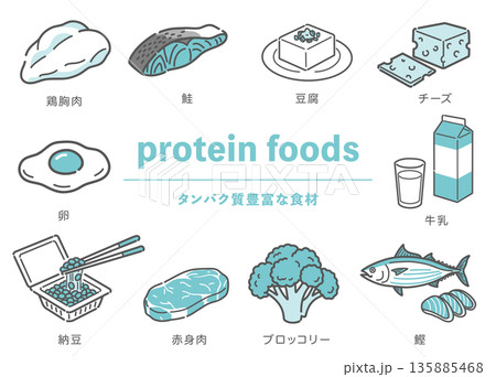 タンパク質が豊富な食材のイラストセット(肉・魚・豆・乳製品・野菜)