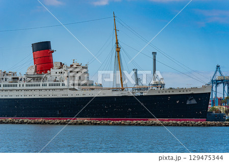 アメリカ 青空と記念艦のキュナード社客船クイーンメリー号 ロサンゼルス ロングビーチ