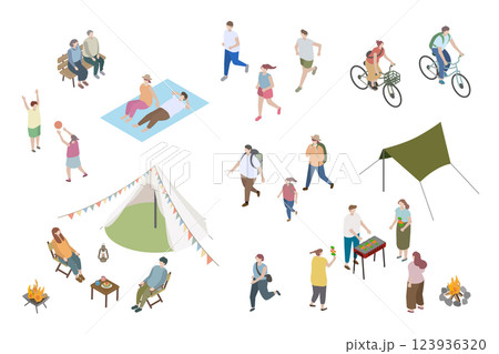 アウトドアを楽しむ人々のイラスト、アイソメトリック、アイソメ