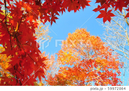 色鮮やかな錦秋の森 青空背景の紅いモミジ
