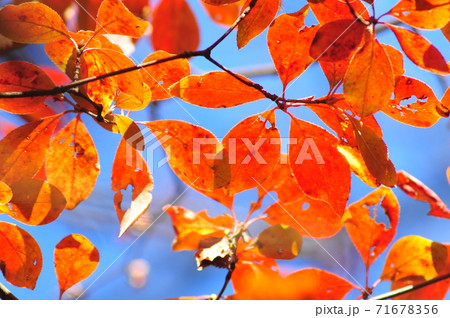 秋晴れと紅葉樹(青空背景) 青空に映える紅葉樹