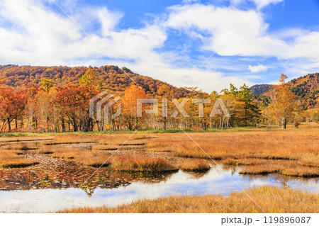 尾瀬ヶ原の紅葉 木道と燧ケ岳