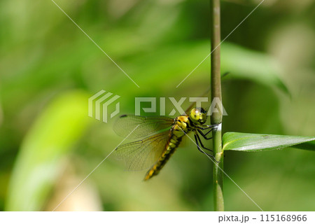 水辺近くの畦に黄色いハラビロトンボのメス(自然光+望遠マクロ接写写真)