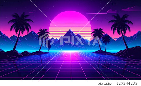 Palm trees in the futuristic style of the 80s. Triangle with silhouettes of tropical palm trees synthwave 80s. Design for banners and posters, advertising products. Vector illustration