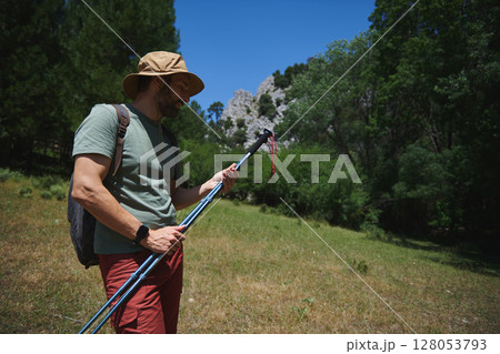 Man Preparing Hiking Gear in Serene Mountain Landscape