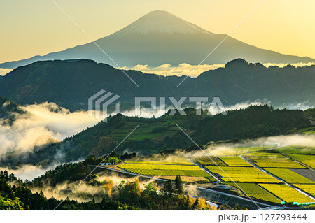 朝霧に包まれた茶畑と富士