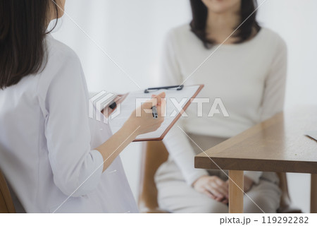 診察を受ける患者の女性と話を聞く医師・医者(婦人科・性病検査・性感染症・中絶)
