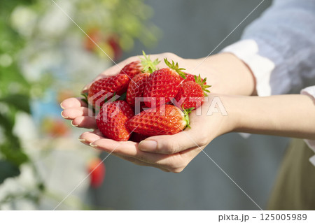 ビニールハウスにいる女性の手のひらに乗る新鮮ないちご
