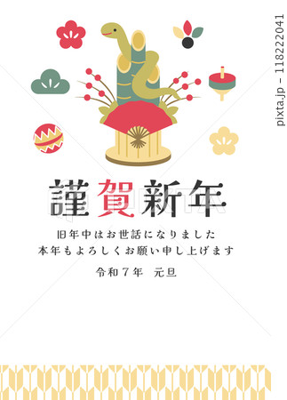 蛇だるまと門松のシンプルな年賀状(2025年,年賀状じまい)