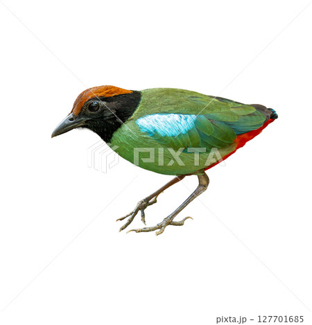 Colorful Hooded Pitta standing isolated on white background.