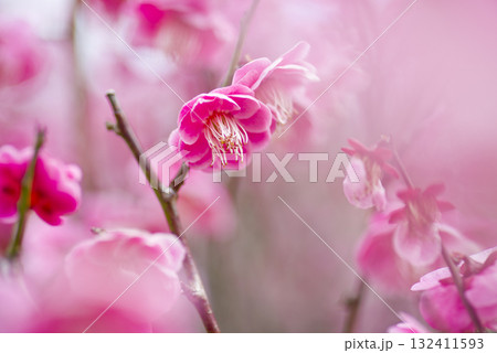 新春を告げる満開の清楚でかわいい淡いピンクの紅梅