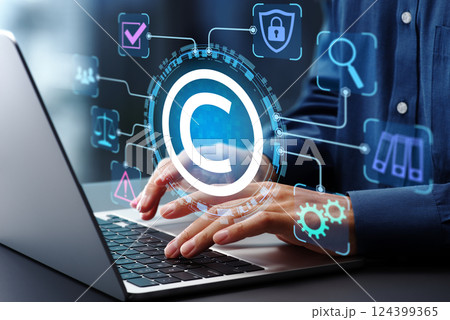 著作権管理ソリューション。デジタル著作権管理DRM。知的財産権とコンテンツ保護。ノートパソコンを使っ