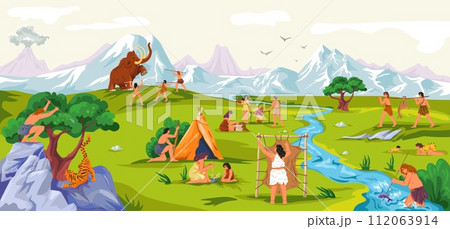 Primitive tribe life. Prehistoric people scene, caveman fur animals hunting gets tool food or fire, family characters ancient clothes stone age history recent vector illustration