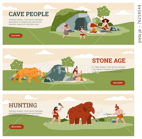 Banners or flyers with stone age primitive people, cartoon vector illustration.