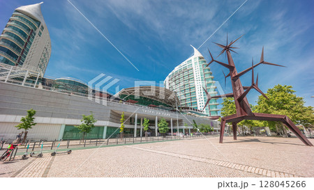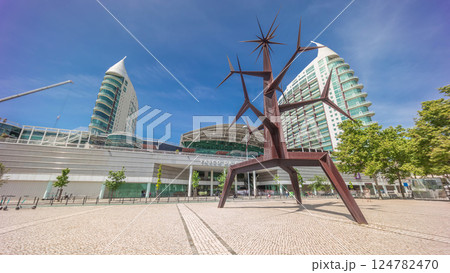 Visitors coming in and out of the Vasco da Gama Shopping mall timelapse hyperlapse, modern towers in the background. Lisbon, Portugal