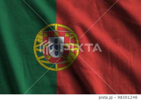 Portugal flag with big folds waving close up under the studio light indoors. The official symbols and colors in banner