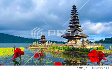 ウルン・ダヌ・ブラタン寺院とブラタン湖と赤い花