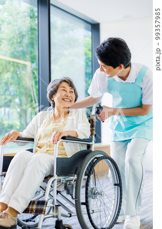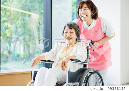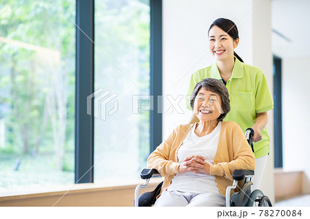 介護施設の高齢者と若い女性スタッフ 撮影協力「LINK FOREST」