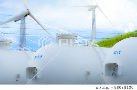 H2 fuel storage tank with green hydrogen concept. Sustainable renewable energy. Net zero emissions by 2050. Solar panel and wind turbine generate electricity for hydrogen gas production. Clean energy.