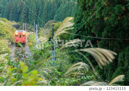 色付く山を背景に一六曲がりを行く黄色の列車(JR九州 キハ125形)