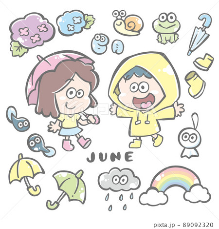 梅雨、6月の雨の日の傘をさす男の子と紫陽花とカタツムリの色鉛筆風手書きイラスト