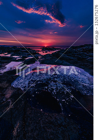 夜明けの輝き ― 岩礁を染める朝焼けの海