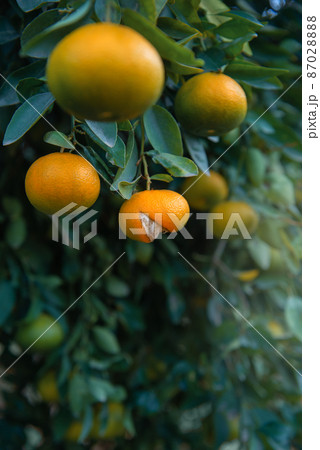 Ripe tangerine fruit with split peel on a tree in citrus grove, vertical shot