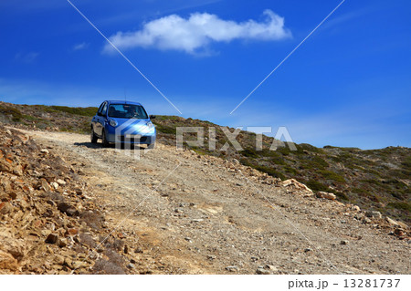The car on a dirt road on a mountain slope. Greece. Rhodes..