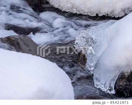 豪雪地帯の小川の岩に積もる雪と結氷 (北海道、伊達市、大滝区)