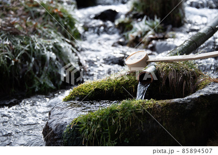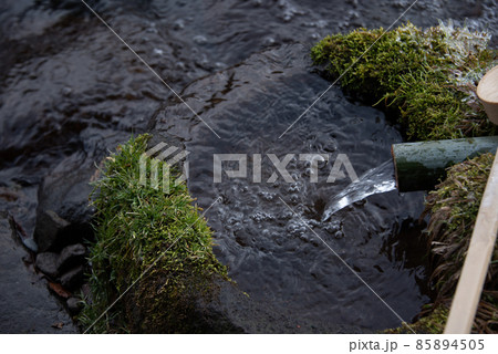 小川にかかる竹を流れる清流の流れ