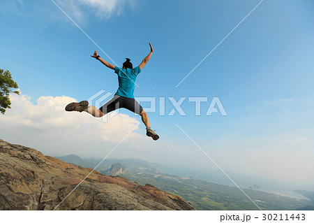 successful woman jumping on rocky mountain peak