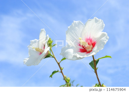 青空に咲く白いムクゲの花