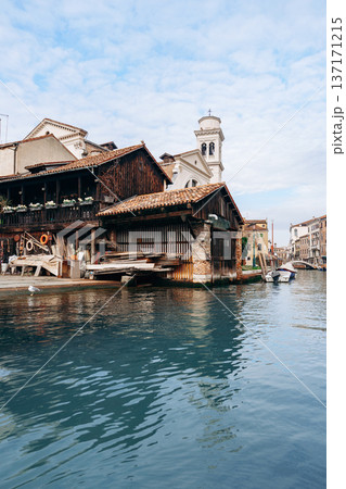 Waterfront view with buildings and boats in a canal during a cloudy day in Venice