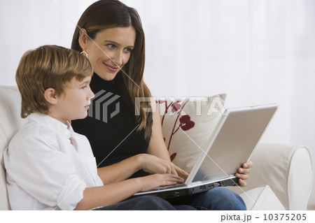 Mother and son looking at laptop