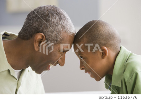 African American grandfather and grandson touching foreheads