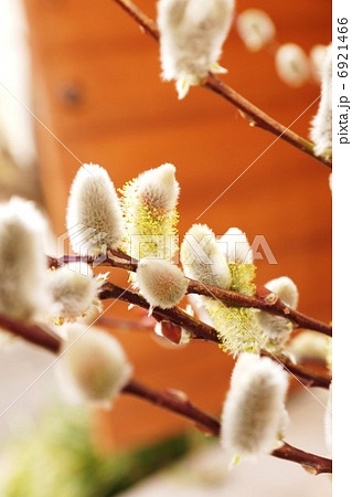 春の素材・春の光を浴びる猫柳の花・横位置アップ
