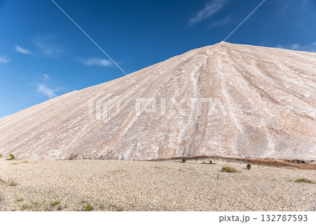 Potassium ore dump. Massive mound potash waste rises deep blue sky, its surface marked by mineral lines erosion patterns. Arid landscape sparse vegetation industrial origin and stark natural contrast