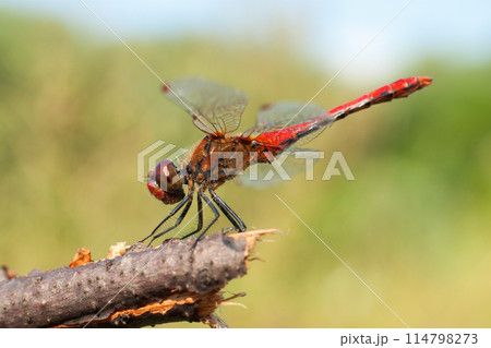 Beautiful Red dragonfly, Sympetrum sanguineum on green background close up.