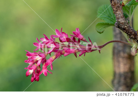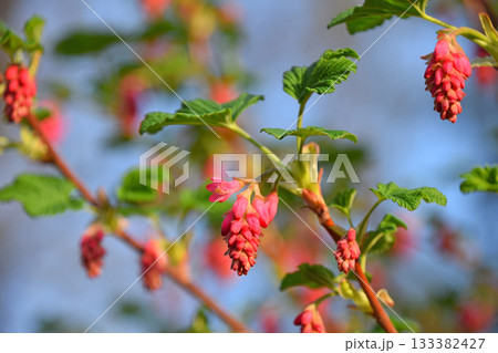 Red flowering currant blossoms ribes sanguineum with green leaves