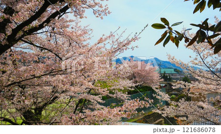 佐野市 城山公園(佐野城跡)散策路と満開桜と東屋