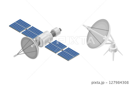 Space orbital satellite and dish antenna, wireless communication equipments isometric vector illustration