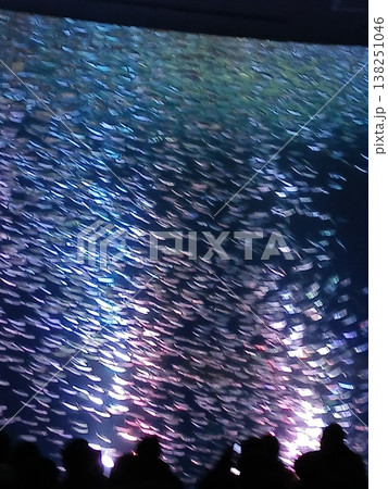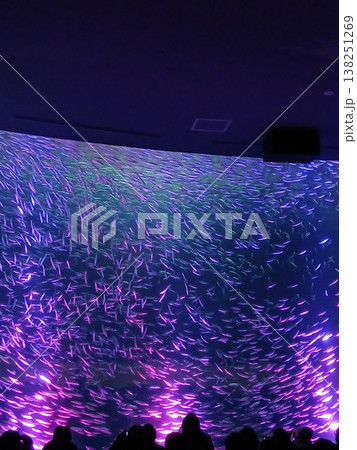 水族館で広がるイワシの群泳と観客シルエット|紫に輝く幻想的な海中展示
